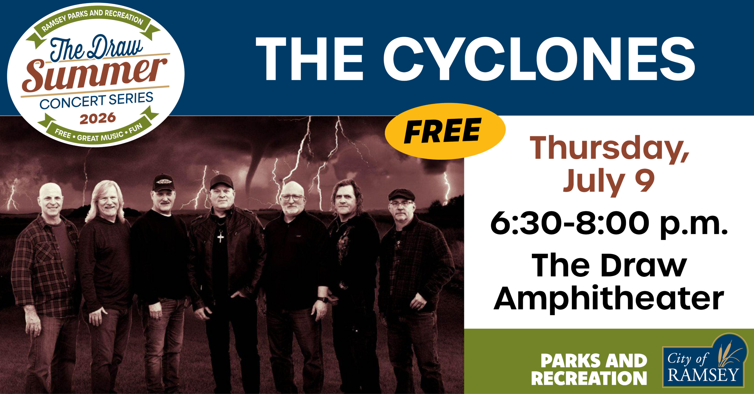 The Cyclones are made up of seven high school friends who were brought together through music as teenagers in the 70’s and into the 80’s, then ventured out in many different bands and projects throughout the 80’s, 90’s and beyond. Fate played a hand in bringing this group of high school classmates back together in 2024 when Pete Lutgen was asked if he could pull together some musicians for an upcoming benefit. Pete reached out to a number of friends from high school and a short time later The Cyclones were born. With just a couple months to pull together a show, they had so much fun working up the songs and playing the benefit, that a week later over dinner it was decided to continue on with this endeavor and continue entertaining people.
