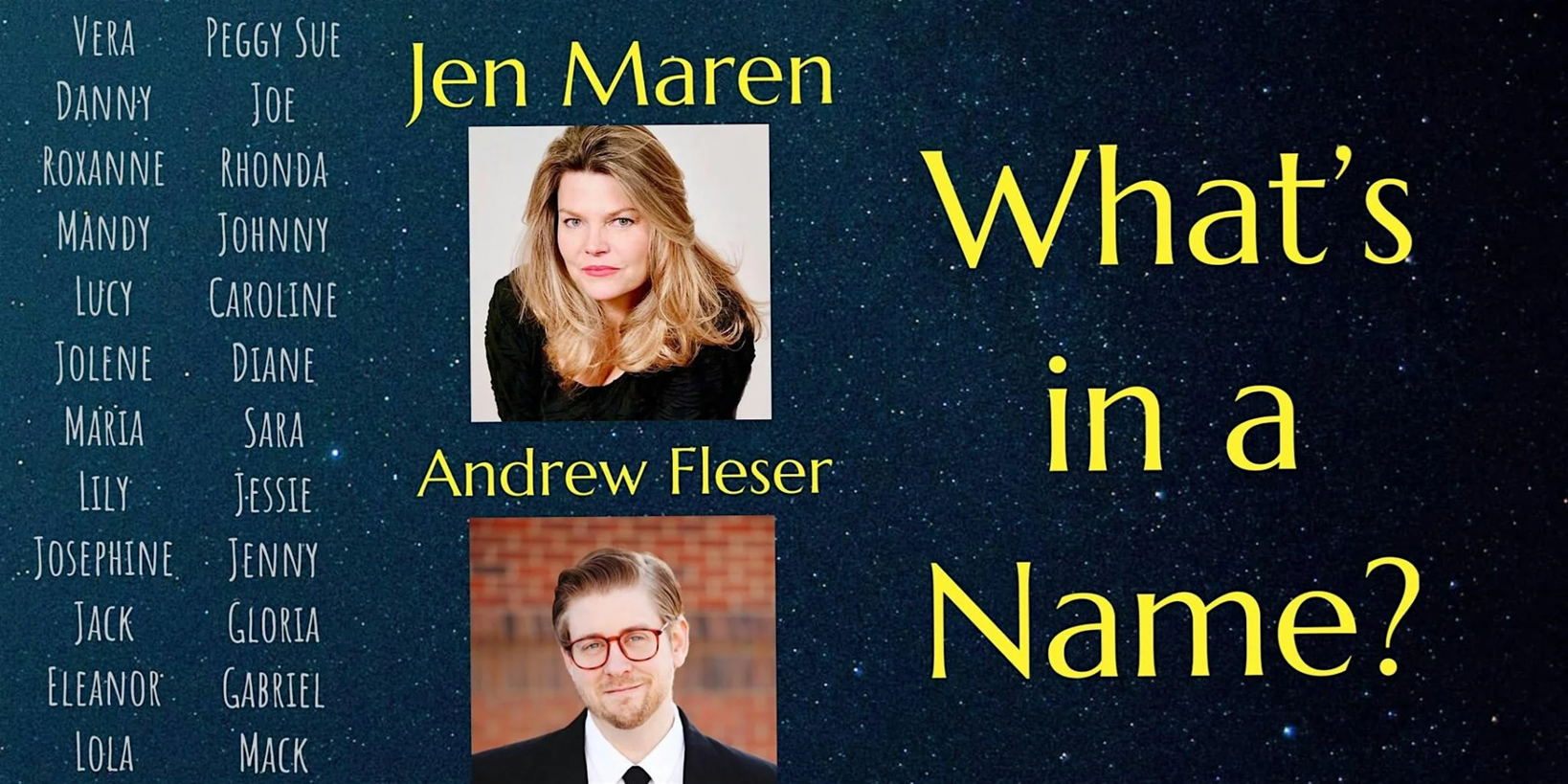 What’s in a name? Well, for many songwriters, it seems there is quite a bit! Across all music genres there are songs named after people: Maria, Jenny, Jack, Barbara Ann, Mack, Mandy, Jolene, Danny Boy, Dulcinea, and so many more. From Broadway to Pop to Country to Swing, join Jen, Andrew, and special guest Doug Anderson as they sing and play an eclectic mix of songs with names as their titles. 80% Music + 20% comedy = 100% Fun!